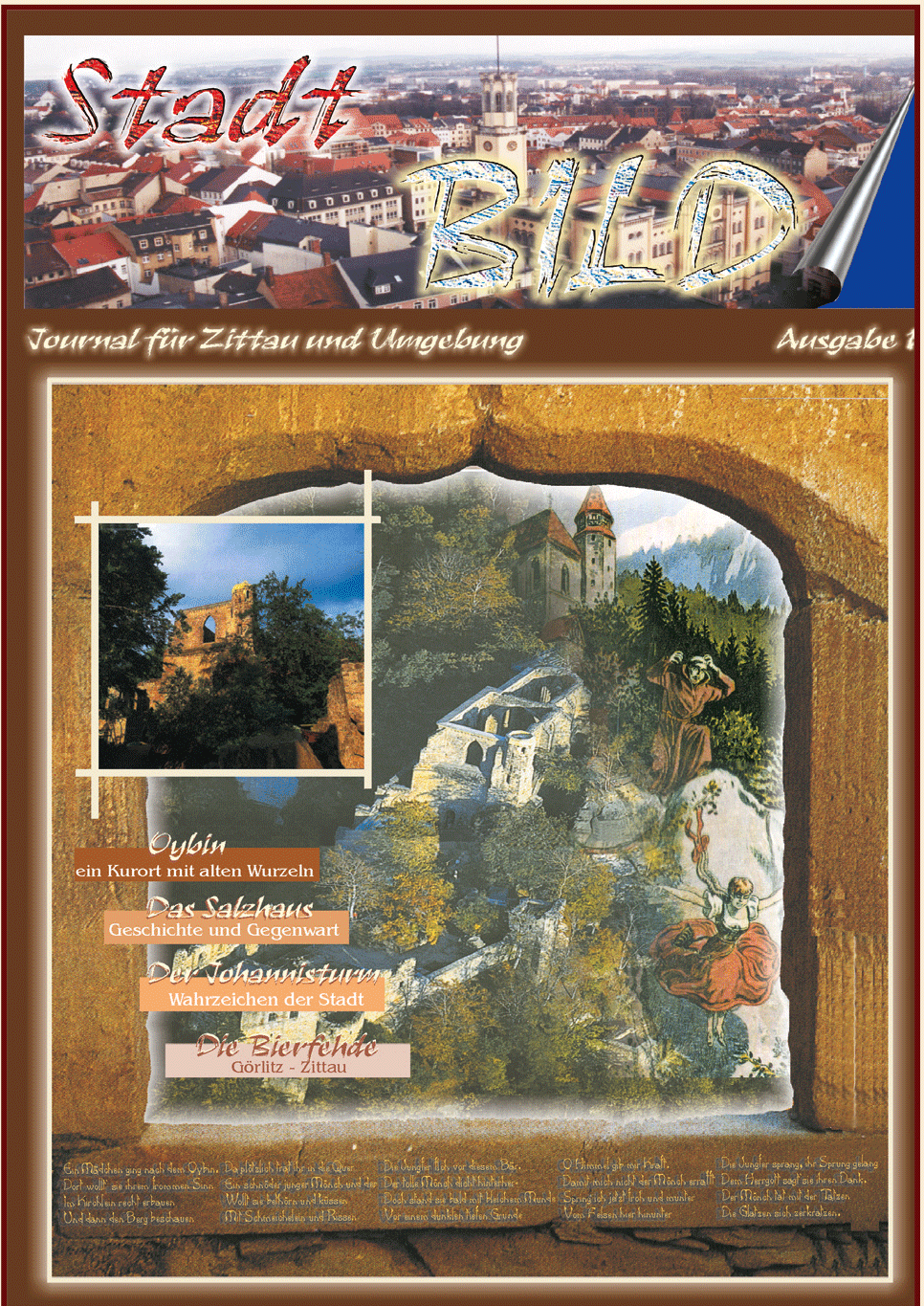 Since the StadtBILD for Görlitz got off to a successful start, another series was launched in April 2000, the “StadtBILD – Journal for Zittau and the surrounding area”. The foreword was written by none other than the former Oybin pastor, later Zittau district administrator and Saxon Interior Minister Heinz Eggert. He wrote: “It is little known in the world. The 750-year-old town of Zittau is located in the southeasternmost tip of Saxony, at the border triangle with the Czech Republic and Poland, in the middle of a varied low mountain landscape. […] Anyone who comes here will also understand why the eventful history of this region and its beauty hold promise, even after the structural change after the fall of the Wall. The people who live here live from history, from the beauty of this landscape and from the hope for change. All of this is little known in the world. Maybe this magazine will make some things better known.” The topics of the first Zittau magazine included the former city wall, the St. John's Church, the Weinau restaurant, the castle and monastery complex on the Oybin, the salt house, the Dornspachhaus and the old high school in Zittau.